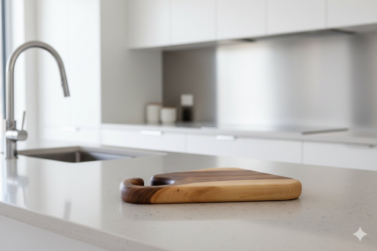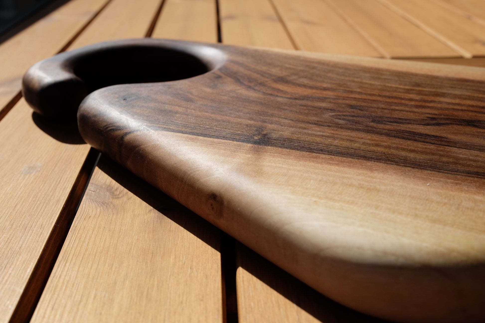 Tek parça masif ceviz ağacından üretilen bu kesme tahtası, sıra dışı tasarımıyla farklı ve özgün ürünleri tercih edenlere hitap eder. Cevizin açık ve koyu tonlardaki doğal damar yapısı, her ürünü benzersiz kılarak mutfağınıza estetik bir karakter kazandırır.